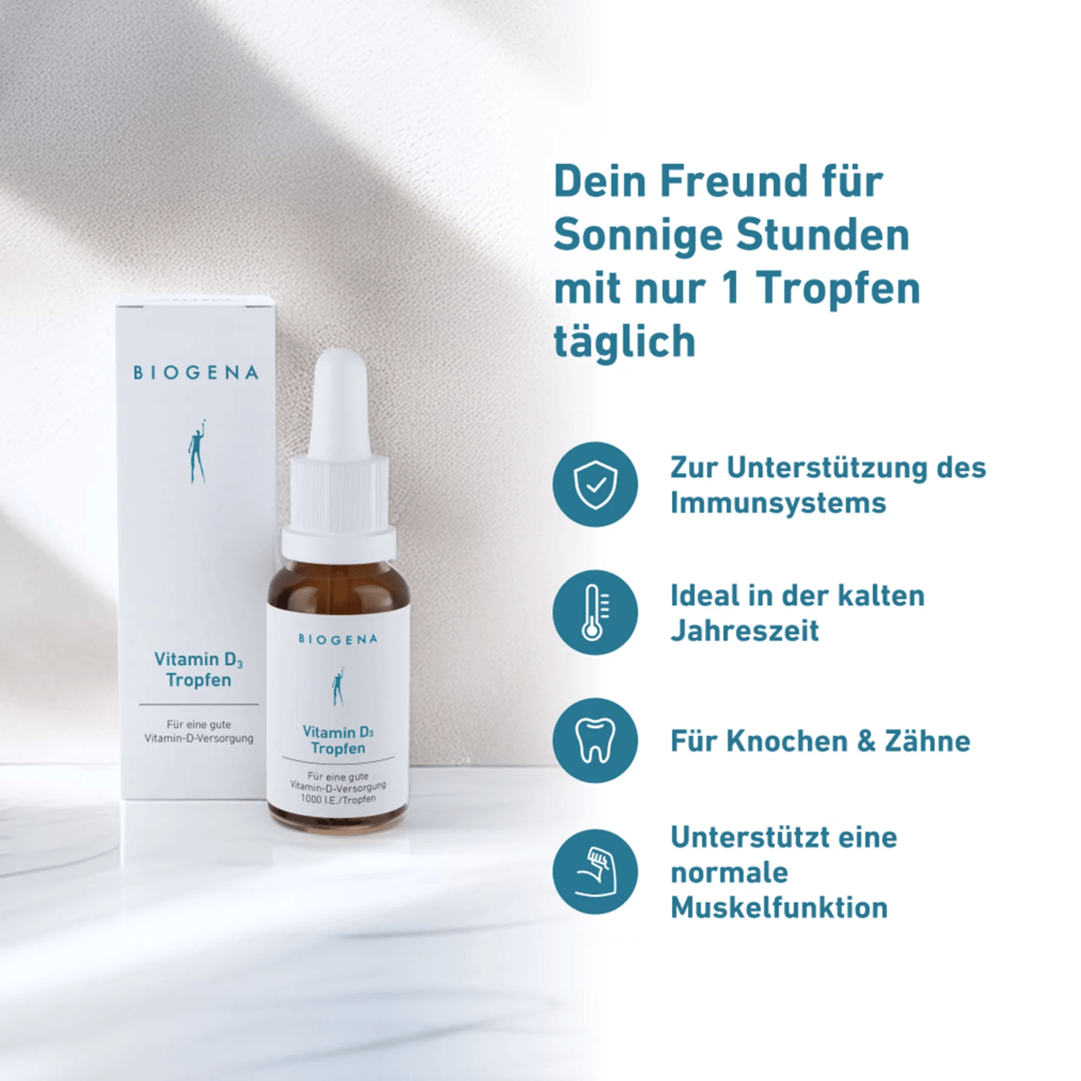 Vitamin D3 unterstützt den Erhalt gesunder Knochen, das Immunsystem und die normale Muskelfunktion – besonders wichtig, wenn die Sonne im Herbst und Winter nicht ausreicht, um den Bedarf zu decken.